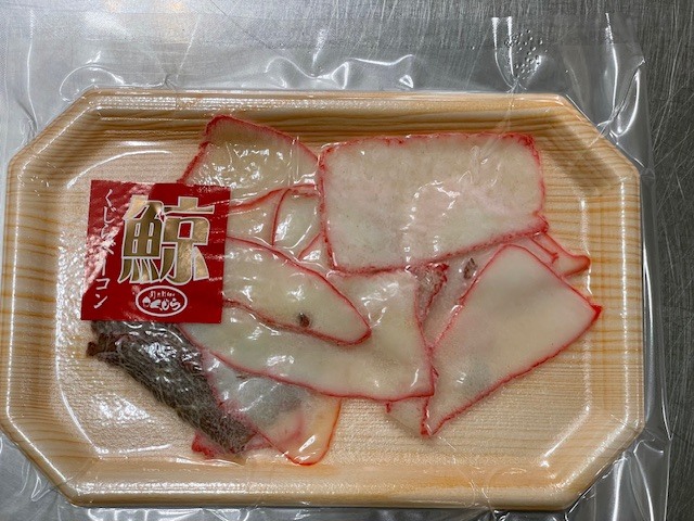 口当たりがまろやかで、畝須ベーコンに比べると、やわらかく濃厚な味です。数種類の鯨種や部位をブレンドしておりますので、飽きのこない箸のすすむ美味しさです。